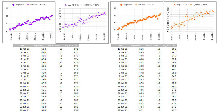 Sur limage suivante, on voit d'autres graphes que la feuille calcule également. L'on voit l'évolution de la vitesse moyenne (cercles) et le pourcentage d’erreurs calculée par jour en fonction des jours d'entraînement (à gauche pour l'anglais et à droite pour le français). A ma grande surprise, ma vitesse et la progression sont très similaire pour les 2 langues.