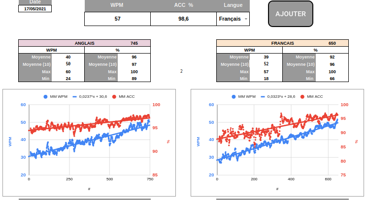 Pour suivre mon évolution au fil des jours, je mes suis fait une petite feuille de calcul sur Google Sheets. Ce superbe outil gratuit dont je vais très prochainement écrire des articles sur le pourquoi c'est si cool et quelles sont les genres de choses qu'on peut faire avec. Mais poursuivons sur le sujet principal, j'ai fais cette feuille de calcul où je peux copier la vitesse de frappe (en wpm) et la précision (en %) de chaque séquence que je fais. j'ai distingué les séquences en anglais sur typeracer.com, des séquences en français sur 10fastfingers.com. La feuille me calcule automatiquement, pour la vitesse et la précision, la moyenne totale, la moyenne des 10 dernières séquences, le min, le max, et trace la moyenne mobile des 10 dernières séquences en fonction du nombre de séquences. Si "moyenne mobile" ça ne vous parle pas du tout, vous pouvez m'écrire à g_tulio86@hotmail.com, je me ferai une joie de l'expliquer.